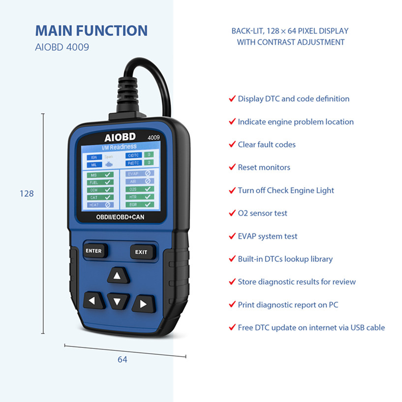 The AIOBD 4009 code reader is a professional scan tool, it allows car owners to check the state emission monitor status of the car, and solve basic engine problems quickly and efficiently. It works for 1996 US-Based, 2000 EU-Based and Asian cars from 2006 vehicles; Supports all OBD II protocols: CAN, J1850 PWM, J1850 VPW, ISO9141 and KWP2000.